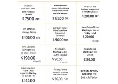 We provide garage door repair & installation, track repair, spring repair, door replacement, tune‑ups, safety inspections, opener installation, and quieter nylon roller upgrades. Our discounts include $75 OFF repair with parts purchase, $100 OFF single garage doors, new operators starting at $190 + install, tune‑ups from $140, $125 OFF ¾ HP Belt Drive openers, nylon rollers for $90, and spring repair starting at $80.